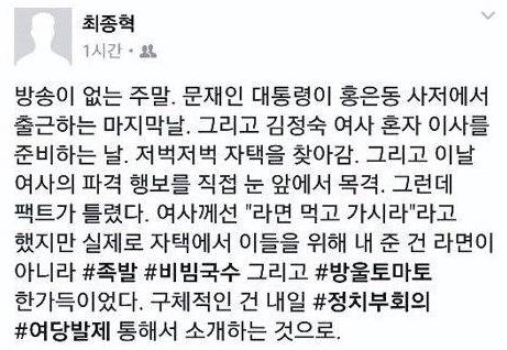 앞서 다른 매체들은 김정숙 여사가 민원인에게 라면을 대접했다고 소개했었다. 하지만 14일 JTBC 최종혁 기자가 자신의 페이스북에 "문재인 대통령의 홍은동 사저에서 이사를 준비하는 김정숙 여사의 파격 행보를 목격했다"며 "(음식을 달라고 찾아온 민원인에게) '라면 먹고 가시라'고 했지만 실제로 내준건 족발, 비빔국수, 방울토마토였다"고 게재하며 다른 매체들의 보도도 일제히 수정됐다.