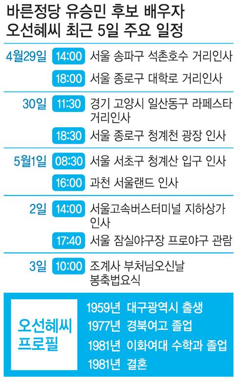 하지만 오씨는 최근 많이 정신적으로 힘들었다고 했다. 2015년 새누리당 원내대표 사퇴에서 지난해 총선 공천 논란, 박근혜 전 대통령 탄핵사태에 이르기까지 유독 최근 2년간 유 후보의 정치적 굴곡이 심했기 때문이다. “힘든 일은 한꺼번에 찾아온다고 하는데 2년 동안 정말 힘들었다”고 토로했다.