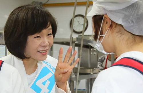 | 점심 배식 봉사장 찾아 지지호소 바른정당 유승민 후보의 부인 오선혜씨(왼쪽)가 지난달 28일 오전 서울 서초구 방배동 방배노인종합복지관을 찾아 점심 배식을 준비하는 자원봉사자에게 유 후보의 기호 4번을 뜻하는 손가락 4개를 펴며 지지를 호소하고 있다. 연합뉴스 |