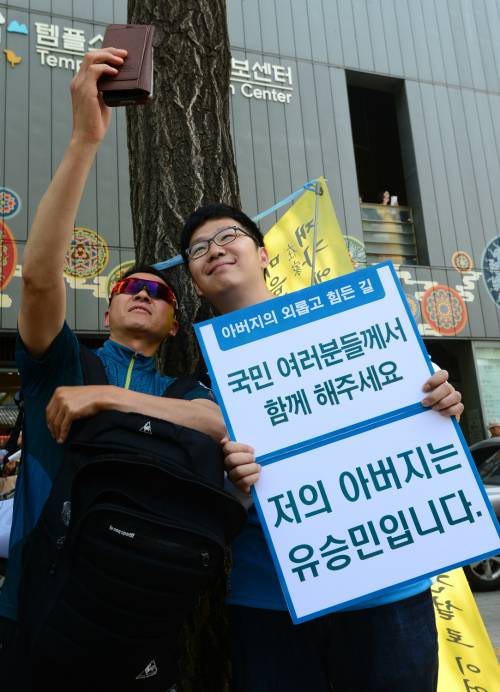 | 부처님오신날인 3일 서울 종로구 조계사 앞에서 바른정당 유승민 대선후보 아들 유훈동 씨가 피켓을 들고 시민들과 사진을 찍고 있다. 남정탁 기자 |