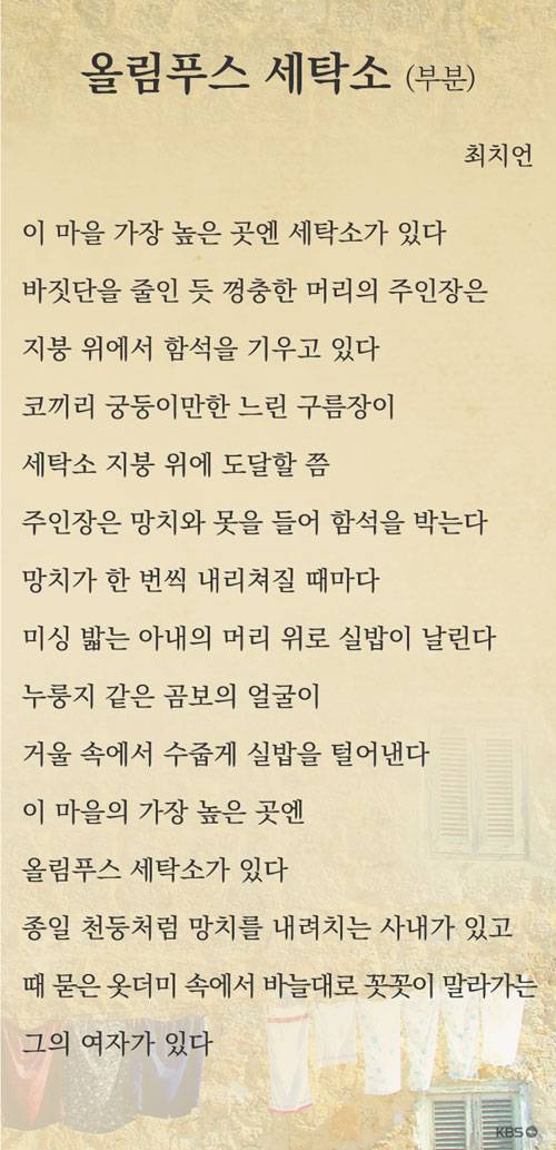 시인은 이런 달동네 세탁소의 풍경이 안타까웠는지 인류 역사상 가장 장엄한 건축물인 그리스 아테네의 올림포스 신전이라는 칭호를 붙였습니다. 지붕에 올라 함석판을 망치로 두드리는 남편은 천둥과 번개를 마음대로 부린 제우스 신이었고요, 아낙은 제우스의 부인 헤라였거나, 지혜의 여신이면서 직물의 여신이기도 했던 아테네였겠지요.