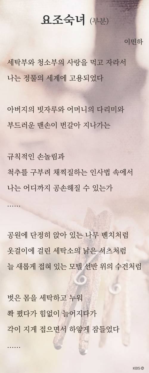 청소하는 아버지와 세탁일을 하시는 어머니 사이에서 태어난 시인은 세탁소에 걸려 있는 셔츠나 반듯하게 접혀 있는 수건을 보면서 문득 오버랩되는 자신을 발견합니다. 세상에서 살아남기 위해 늘 허리를 구부려 공손해야 하고, 마치 정물처럼 감정을 드러내지 말아야 합니다. 파김치가 되어 돌아온 집에서조차 마음껏 두 다리 뻗지 못하고 각이 접히는 세탁소의 옷들처럼 쪼그리고 자야 하는 신세를 떠올립니다.