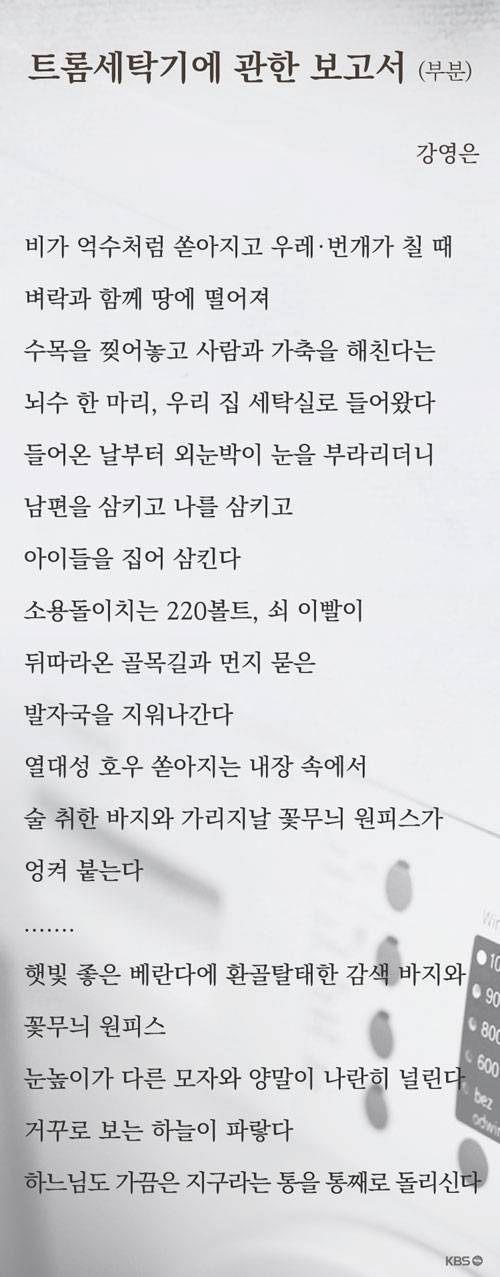 시인의 기발한 상상력에 절로 웃음이 나옵니다. 온갖 세탁물을 삼키고 우당탕탕 돌아가는 통돌이 세탁기를 시인은 무시무시한 외눈박이 짐승에 빗댑니다. 이 짐승은 남편의 술 취한 바지도 자신의 꽃무늬 원피스도 아이들 모자와 양말도, 그 옷에 묻어오는 온갖 삶의 흔적과 얼룩도 닥치는 대로 삼켜버립니다.