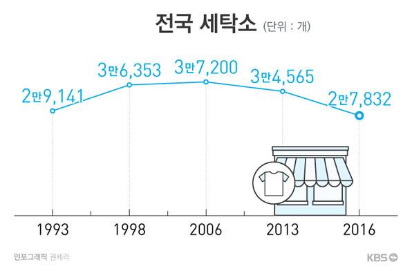 1993년 2만 9141개였던 세탁소는 1998년 3만 6천353개로 늘었고, 2006년 3만 7200개로 정점을 찍었습니다. 그러나 2013년 3만 4천565개로 줄더니 2016년에는 2만 7천832개로 줄었습니다. 그러니까 10년 만에 만 개의 세탁소가 사라진 것입니다.