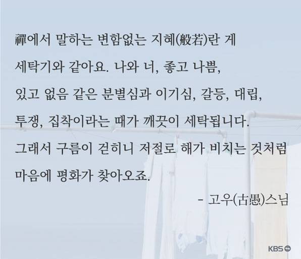 말끔하게 세척되고 빳빳하게 다려져 나온 옷가지를 보고 있노라면 구겨진 영혼도 저렇게 세탁할 수 있으면 얼마나 좋을까 종종 생각해보곤 합니다. 영혼을 세탁하는 데 필요한 세탁기는 어떤 것이고, 넣어야 할 세제는 또 무엇인가 곰곰이 생각해봅니다. 우리나라의 대표적인 선승이시면서 경북 봉화의 금봉암에서 선수행을 이끌고 계시는 고우 스님은 선(禪)수행을 세탁에 비유합니다.