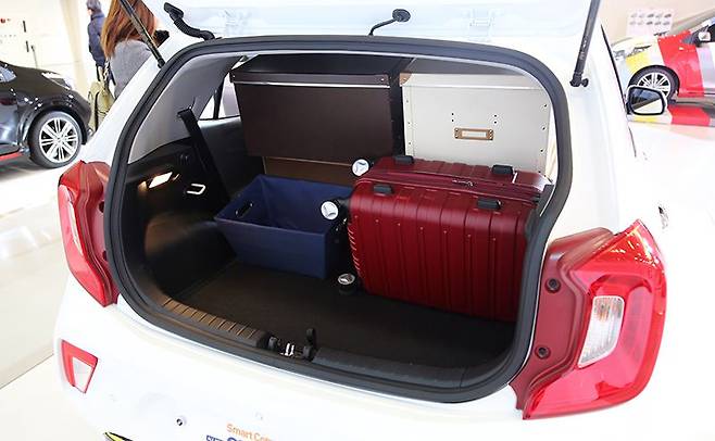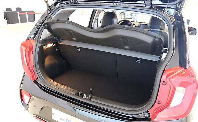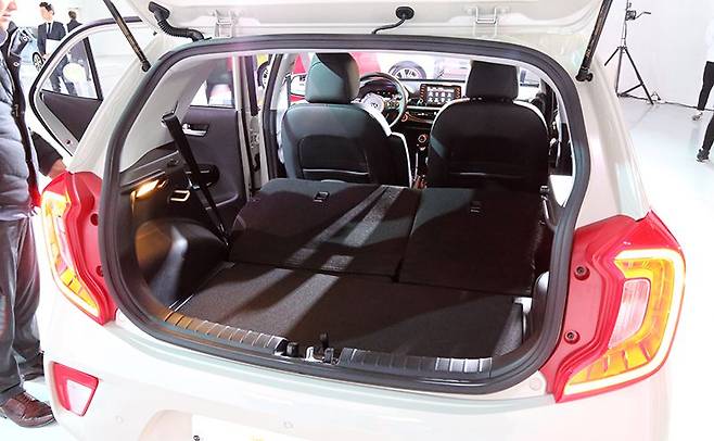 기존 모닝 대비 28% 넓어졌다는 적재공간은 255리터다. 6:4로 접히는 뒷자리 등받이도 적재공간 확대를 위한 모닝의 필살기다. 스파크와 달리 엉덩이 받침을 접지 않고 바로 등받이를 눕히는 점, 그럼에도 제법 평평한 바닥을 만드는 점은 칭찬할 만 하다. 그렇게 얻어진 공간은 1,010리터.