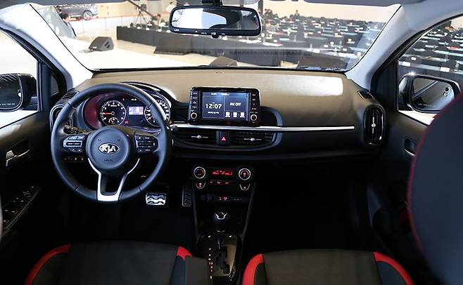 대시보드 좌우를 가로지르는 금속 선은 실내를 넓어 보이게 한다. 동그란 에어컨 송풍구와 도어패널, 기어노브 주변에 적용된 포인트 컬러는 경차다운 발랄함을 잘 살려준다.