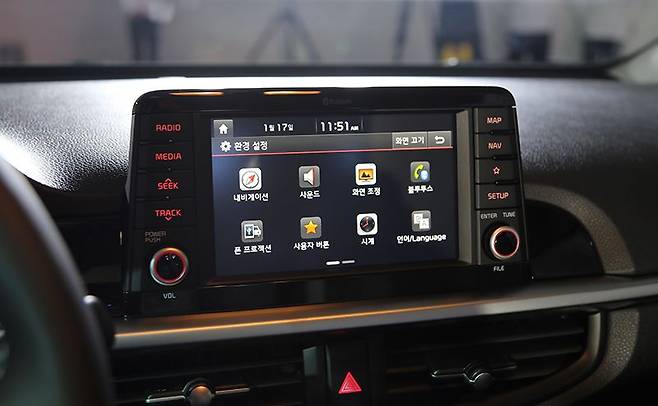 플로팅 디자인의 AV 조작부도 모닝의 자랑 중 하나. 스마트네비게이션 옵션(75만 원)을 적용하면 후방카메라와 함께 기아차 전용 T-map을 사용할 수 있다. 후방카메라는 조향 연동 기능까지 지원한다.