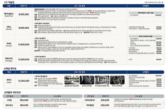 프레스티지 트림에 모든 옵션을 적용하면 가격은 1,410만 원까지 치솟는다. 긴급제동 보조시스템과 슬라이딩 센터콘솔, 무드 조명이 갖춰진 대형 화장거울 등 여심저격 옵션을 골라 담은 ‘레이디’ 에디션도 눈여겨볼만하다.