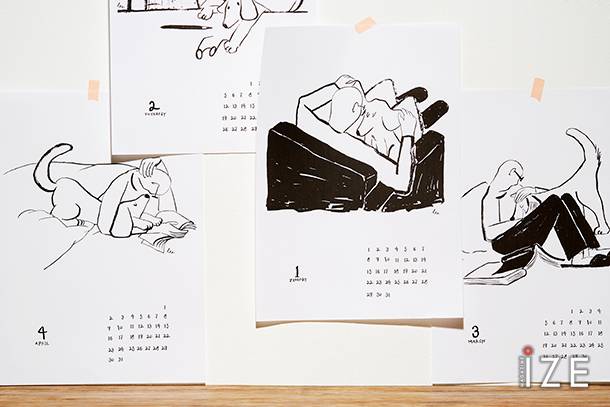 일러스트는 좋지만 귀여운 것보다는 심플한 쪽이 취향이라면, 혹은 컬러가 부담스럽다면 에토프의 달력을 추천한다. 드로잉과 실크스크린 작업을 주로 하는 에토프가 에코백 또는 티셔츠로 만들어온 ‘그와 그의 개’ 시리즈를 2014년과 2016년에 이어 올해도 달력으로 만들었다. 소파에 앉아 커다란 개와 장난을 치고 있는 남자, 책을 읽다 잠이 든 남자와 책상 위에 올려둔 그의 안경을 건드려보려는 개, 만족스러운 표정으로 눈을 맛보는 개와 그를 쓰다듬어주는 남자의 모습 등 개를 키우든 키우지 않든 이상하게 뭉클해지거나 마음이 따뜻해지는 장면들이 달마다 펼쳐진다. 까만 테두리가 있는 커다란 액자에 넣어 벽에 걸어두고 생각날 때마다 쳐다보고 싶어질 정도다. 안타깝게도 에토프의 홈페이지에서 판매했던 ‘그와 그의 개’ 티셔츠와 에코백은 현재 품절이지만, 드로잉은 서울 서촌의 프레이야 쇼룸에서 상설 전시 및 판매 중이다.