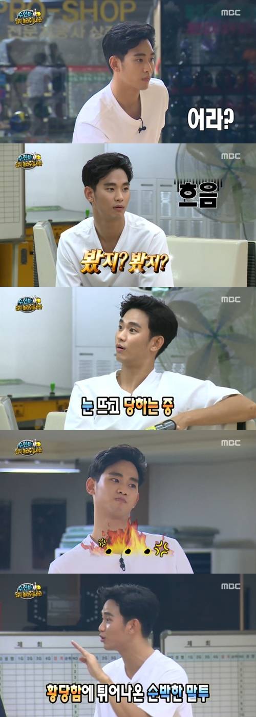 어느 순간 몰카를 눈치챈 김수현은 하하의 투구에 핀이 앞으로 넘어지자 몰카를 확신하고 "형, 핀이 앞으로 넘어갔다"며 웃었다. 황당함에 튀어나온 순진한 말투가 튀어나와 '잘생긴 빙구'의 면모를 제대로 보여줬다. (사진=MBC 캡처)