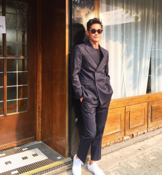 배정남은 모델 출신답게 더블 단추로 된 정장을 완벽하게 소화했으며, 선글라스와 흰 운동화로 멋을 더했다.