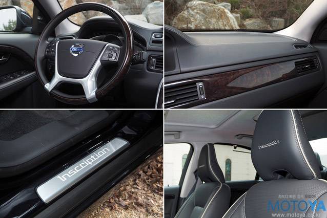 인스크립션 모델과 일반 모델과의 주요한 차이는 외관보다 실내 쪽에 있다. 도어를 열고 실내에 들어 서면, 보통의 S80과는 분위기가 제법 다른 것을 느낄 수 있다. 대시보드 상단을 두 조각의 가죽으로 덮는 한 편, 좌석과 도어 트림의 가죽 마감 역시 전용 소재를 적용했다. 실내의 악센트를 이루는 목재 패널 등에도 전용 소재가 적용되어 인스크립션 모델만의 고급스러운 분위기를 자아낸다.