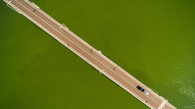 | ▲ 지난해 8월, 대구 달성군 낙동강 달성보 하류 3km 지점 박석진교 일대에 녹조가 창궐해 강 전체를 뒤 덮고 있다. |