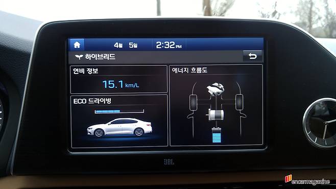 조금 더 돈을 주고서라도 하이브리드 모델을 선택하는 경우는 더 나은 가속력과 연비 때문이다. 그랜저 하이브리드의 가속력은 앞서 언급했듯이 충분히 투자할 가치가 있다. 그렇다면 연비는? 시승 중 기록한 평균연비는 15.1km/L로 복합연비 16.2km/L에 미치지 못했다. 비가 내렸고 주행의 많은 부분을 스포츠 모드로 달렸다는 점을 고려하면 수긍할 만하다.