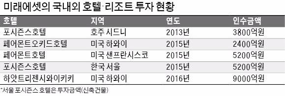 본격적인 투자는 4년 전 시작됐다. 미래에셋자산운용은 2013년 호주 시드니에 있는 최고급 호텔 포시즌스를 약 3800억원에 인수했다. 2015년에는 미국 하와이의 페어몬트오키드호텔과 샌프란시스코의 페어몬트호텔을 연달아 사들였다. 이듬해엔 하와이의 하얏트리젠시와이키키 리조트를 약 9000억원에 인수했다.