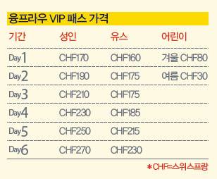 융프라우에서 연속으로 하루 이상 머무는 고객들을 위해 융프라우철도에서 출시한 교통 패스. 1일부터 6일까지 융프라우에 머무는 시간별로 구매할 수 있다. 만 6세부터 15세까지 이용하는 어린이 패스, 만 16세부터 25세까지 이용하는 유스 패스도 별도로 판매하고 있어 허니무너, 배낭여행객뿐만 아니라 가족여행객들에게도 유용하다. 사용 기간 동안 융프라우요흐 1회 왕복을 포함해 6개 노선을 무제한으로 이용할 수 있으며 융프라우 지역 곳곳에서 다양한 혜택을 받을 수 있다. 여름·겨울 시즌으로 구분되는데 올해 여름 VIP 패스 기간은 11월26일까지. 현지 역에서 발권시 혜택이 큰 할인쿠폰을 전국 주요 여행사에서 배포하고 있다.