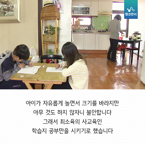 한국으로 시집와 10년째 사는 일본댁 혼마 미유키 씨. 두 아이의 엄마이자 프로 주부인 미유키 씨에게는 고민이 하나 있습니다. 바로 한국의 사교육 열풍 때문인데요. 미유키 씨는 '자신만큼은 절대 사교육을 시키지 않겠다'고 결심했지만, 열심히 학원에 다니는 아이들 또래 친구들을 볼 때면 결심이 흔들립니다. 아이가 자유롭게 놀면서 크기를 바라지만 아무것도 안 하자니 불안합니다. 결국 미유키 씨는 최소한의 사교육인 학습지 공부를 시키는 중입니다. "일본에서 아이를 키웠으면 학습지도 거의 안 할 것 같다"는 미유키 씨는 한국의 사교육 열풍이 이해가 안 갑니다.