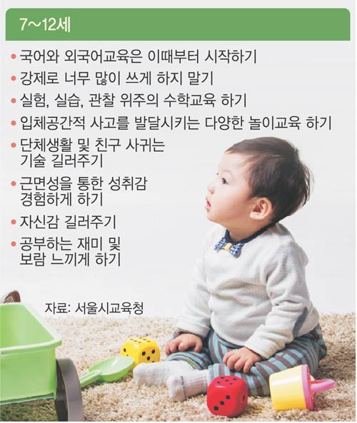 0∼3세는 뇌의 모든 부위가 골고루 발달하는 시기로, 정서 발달을 중심으로 오감 자극을 통한 전반적인 두뇌 발달을 꾀해야 하는 때다. 4∼6세의 경우 전두엽(종합적 사고능력과 인간성, 도덕성을 담당하는 뇌 부위)이, 7∼12세는 측두엽·두정엽(언어·수학·물리적 사고를 담당하는 뇌 부위)이 보다 빠르게 발달한다. 뇌 발달 차원에서는 4∼6세엔 예절 및 인성 중심의 교육을, 7세가 지나야 본격적인 언어교육을 시작하는 게 바람직하다.