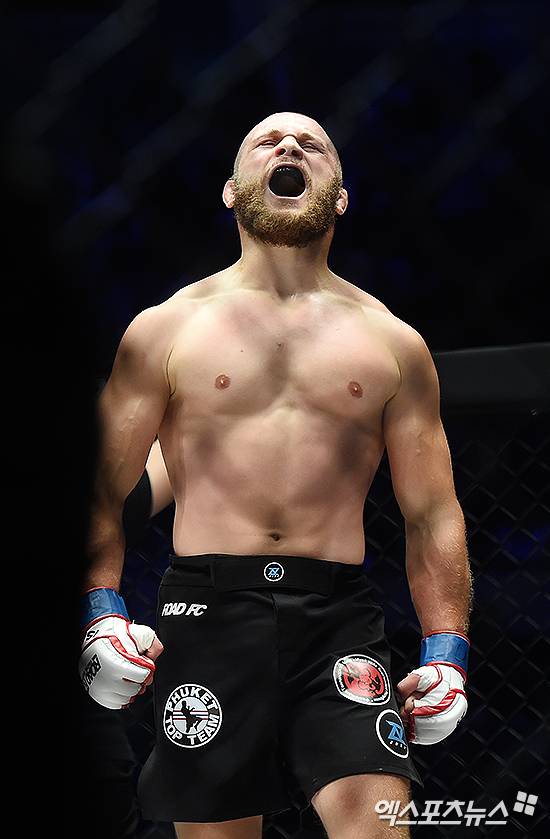 [엑스포츠뉴스 박지영 기자] 10일 오후 서울 장충체육관에서 열린 'XIAOMI ROAD FC 039'(샤오미 로드 FC 039) 100만불 토너먼트 예선 김승연과 라파엘 피지에프의 경기, 라파엘 피지에프가 승리한 뒤 포효하고 있다.