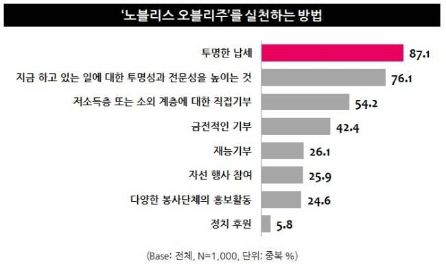 그러면서 노블레스 오블리주를 실천하는 방법으로는 ‘투명한 납세’(87.1%ㆍ중복응답)와 ‘맡은 일에 대한 투명성과 전문성 강화’(76.1%)를 꼽았다. 저소득층ㆍ소외계층에 대한 기부(54.2%)와 금전 기부(42.4%) 등 사회 환원을 요구하는 목소리도 높았다.