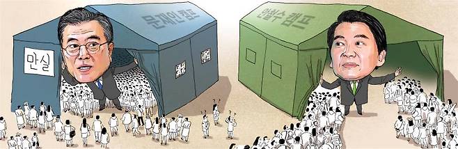 한 달 전만 해도 관료와 교수들의 줄 서기는 여론조사에서 1위를 달리던 문 후보 캠프에 집중됐다. 당시 사정 당국 관계자들의 구체적인 직책과 이름까지 거론되면서 "문 후보를 위해 이들이 조직적으로 움직이고 있다" "연고가 닿는 문재인 캠프 인사들을 찾느라 분주하다"는 말들도 나왔다. 하지만 지난달 25일 국민의당 호남 경선 이후 안철수 후보가 문 후보를 바짝 쫓는 여론조사가 이어지자 이런 현상이 안 후보 측에서 나타나고 있다. 정치권 관계자는 "문 후보에게만 걸 수 없는 상황이라 양다리를 걸치는 것 같다"고 했다.
