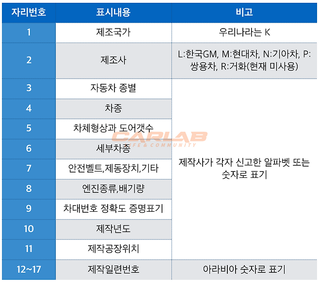 차대번호는 영문과 숫자로 혼합된 17글자로 표기된다. 차대번호 자리별 의미는 국가, 제조사, 차종, 모델, 사양, 차체, 안전벨트 타입, 엔진 타입, 제조년도, 제조공장 등이며, 12~17번째는 제작 일련번호다. 일련번호로 부품확인이나 리콜대상 여부를 확인할 수 있다.