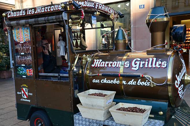 | ▲ 군밤 기차. 성당 앞 광장에는 군밤 같은 먹거리를 파는 노점과 카페가 성업 중이다. |