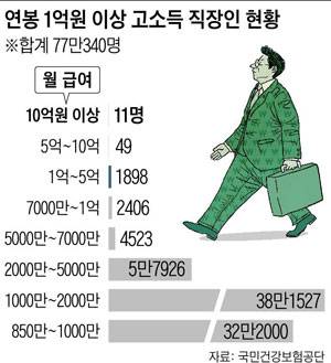 최고액 연봉을 받는 직장인은 연봉이 200억원이 넘는 것으로 알려졌다. 건보공단은 "개인 정보라 누구인지 공개할 수 없지만 대기업 소속 직장가입자"라고 말했다. 그를 포함해 월 10억원(연봉 120억원) 넘는 '수퍼리치' 직장인은 60대 8명, 50대 2명, 40대 1명 등 11명이었다. 자본시장법에 따라 5억원 이상 연봉을 받는 상장회사 등기임원들은 2013년부터 연봉을 사업보고서에 의무 공개하고 있다. 하지만 재계 관계자는 "수퍼리치 직장인 중 일부는 상장사 등기임원으로 등재되지 않은 경우여서 파악하기 쉽지 않다"고 말했다.