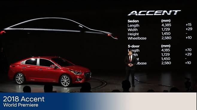 5세대 모델인 신형 엑센트는 커진 차체와 강화된 가속력, 동급 최초 기본으로 적용된 자동 긴급제동 시스템이 특징이다. 엑센트 세단은 전장 4385mm, 전폭 1729mm, 전고 1450mm, 휠베이스 2580mm로 이전 모델 대비 전장 15mm, 전폭 29mm, 휠베이스는 10mm 늘어났다.