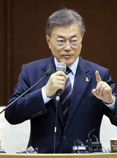 | 더불어민주당 문재인 대선후보가 21일 오전 서울 용산구 한국여성단체협의회에서 열린 대통령 후보 초청 성 평등정책 간담회에 참석, 질의응답을 하고 있다. 연합 |