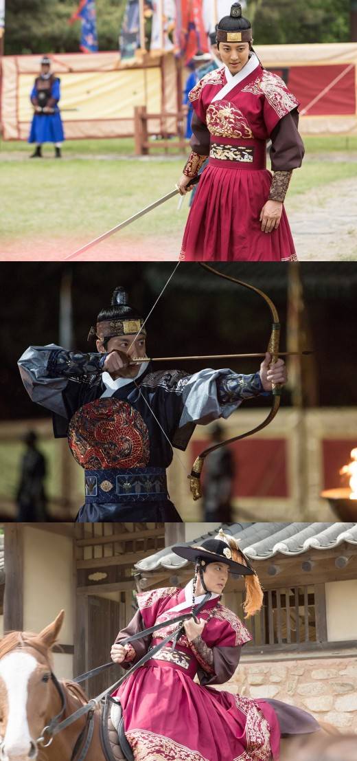 사진은 사극액션의 3종세트로 불리는 검술, 활 쏘기, 말 타기에 도전 중인 이동건의 모습을 담고 있다. 왕의 절대권력을 상징하는 붉은 의상을 입은 채 번쩍 빛을 내는 칼을 휘두르는 이동건. 어두운 밤, 타오르는 불처럼 번뜩이는 눈빛으로 목표를 응시하며 활시위를 팽팽하게 당긴 이동건. 말 위에 올라 허리가 꺾일 만큼 능수능란한 자세로 말을 다루는 이동건. 세 장의 사진 속 이동건의 모습 모두 역동적이고도 강렬해 시선을 강탈한다.
