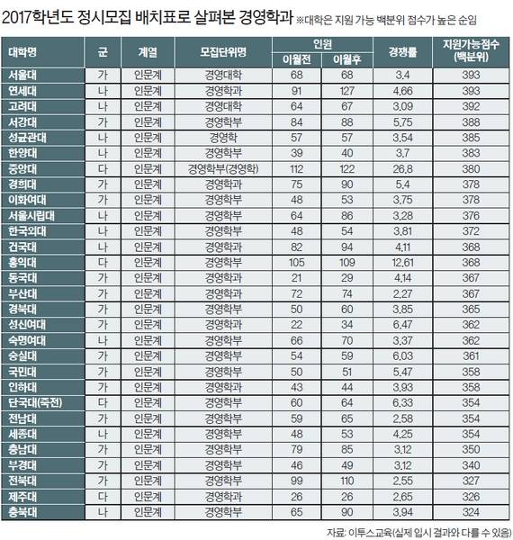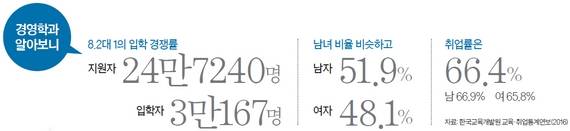 ━ 다국적기업·벤처 등 대학마다 강점 달라 경영학과는 ‘취업률’을 떼놓고 설명하기 어렵다. 2016년 경영학과 졸업생의 취업률은 66.4%(한국교육개발원 취업통계연보)로 인문사회계통 학과 중에 가장 높았다. 고교생들도 경영학과에 가고 싶어 하는 이유로 “취업이 잘 돼서”라고 꼽는 경우가 많다.