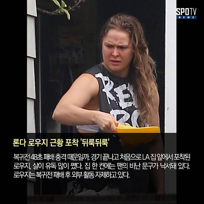지난해 마지막 날(이하 한국 시간) UFC 207에서 복귀전 패배 후 처음으로 로스앤젤레스에 있는 집 앞에서 카메라에 잡힌 론다 로우지(28, 미국)의 모습은 다소 놀랍다.