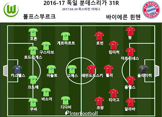 바이에른은 30일 새벽 1시 30분(한국시간) 복스바겐 아레나서 열린 볼프스부르크와 2016-17시즌 독일 분데스리가 31라운드 경기서 6-0으로 완승을 거뒀다.