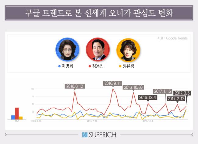 온라인 언급량을 지수화한 ‘구글 트렌드’(Google Trends)로 최근 1년간 신세계 오너가에 대한 관심도를 분석한 결과, 정용진의 평균적인 검색지수는 32로 이명희와 정유경을 합친 수치 19보다 높다.