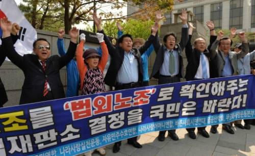 | 보수단체 회원들이 2015년 5월 28일 서울 종로구 헌법재판소 앞에서 해직교사의 전교조 조합원 자격을 제한한 교원노조법 규정이 합헌이라는 헌재 결정이 나오자 만세를 부르고 있다. 남제현 기자 |