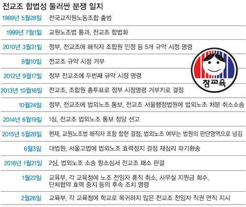 전교조 합법화는 김대중정부가 들어서면서부터 처음으로 논의됐다. 김대중정부가 외환위기 극복 과정에서 설치한 ‘노사정위원회’에서 전교조 합법화가 논의됐고, 교원노조법이 1999년 1월6일 국회를 통과하면서 같은해 7월1일 전교조는 합법노조 지위를 얻었다. 당시 6만2654명이던 전교조 조합원 수는 합법화 이후 9만여명까지 늘었다.