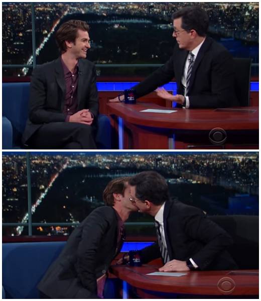 스티븐 콜베어는 “다른 남자와 키스한 적은 없느냐”고 물었다. 처음에 무슨 뜻인지 이해하지 못했던 앤드류 가필드는 스티븐 콜베어와도 키스를 했다.