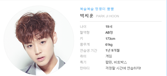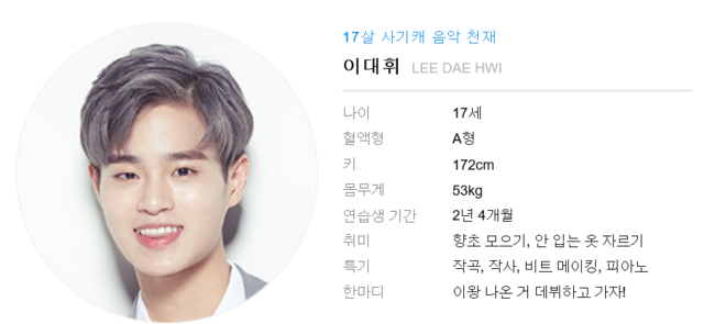 가수는 제목따라 간다는데, 그 이름부터가 심상치않다. 자기 소개 영상에서 골반털기 춤사위로 '시강'에 성공했다. 준수한 외모에 깨방정 댄스로 비글미를 잔뜩 풍긴다. 깨방정 캐릭터로 다른 연습생들과의 차별화에 벌써부터 성공한 인상. 순위도 상위권인데다, 소속사 역시 마마무의 RBW라 더욱 기대가 크다. 대중과의 친화력에 실력으로 무장한 연습생이 될지 첫 방송이 기대되는 캐릭터. / kjseven7@osen.co.kr