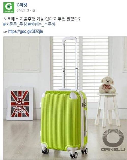 24일 G마켓은 공식 페이스북에 “노룩패스 자율주행 기능 없다고 두번 말했다? #소문은_무성 #바퀴는_스무성”라는 글과 함께 한 장의 사진을 올렸다.