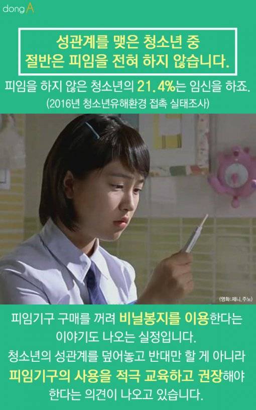 피임을 하지 않은 청소년의 21.4%는 임신을 하죠. (2016년 청소년유해환경 접촉 실태조사)