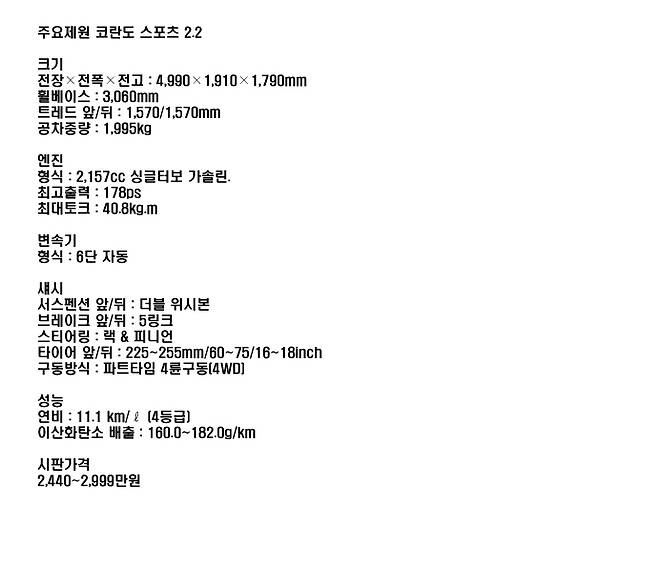 쌍용차의 코란도 스포츠가 새롭게 출시되었다. 기존의 2.0리터 디젤 엔진에서 2.2리터 엔진으로 변경되면서 출력과 토크가 향상되었다. 기존 고객들이 아쉬움을 표했던 주행성능에 대한 개선이 포인트이다. 상용차를 제외하면 국내 유일한하게 오픈 데크를 갖춘 차량이기도 하다.