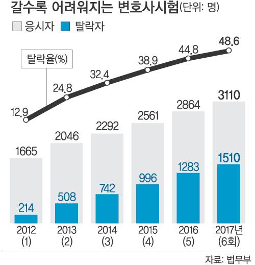 문제는 변시 합격이 갈수록 어려워지고 있다는 점이다. 2012년 1회 변시 당시 87.3%였던 합격률은 해마다 낮아져 올해 6회 변시는 51.2%까지 떨어졌다. 전회 변시에 탈락한 이들이 다음 시험에 재도전함에 따라 응시생은 매년 증가할 수밖에 없다. 그런데 ‘신규 변호사의 자질을 담보해야 한다’는 이유로 합격 정원은 1회 때부터 1500∼1600명 정도로 고정돼 있는 현실이다. 이 때문에 로스쿨 학생들 사이에는 ‘내가 변시낭인이 될지 모른다’는 공포감이 확산하고 있다.