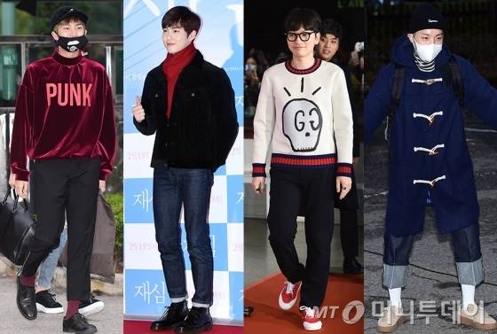 그룹 방탄소년단의 랩몬스터는 벨벳 맨투맨과 삭스를 와인색으로 맞춰 패션감각을 뽐냈다. 여기에 볼캡과 마스크 아이템을 활용해 개성넘치는 스타일링을 완성했다.