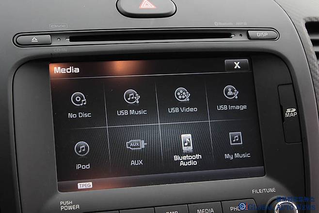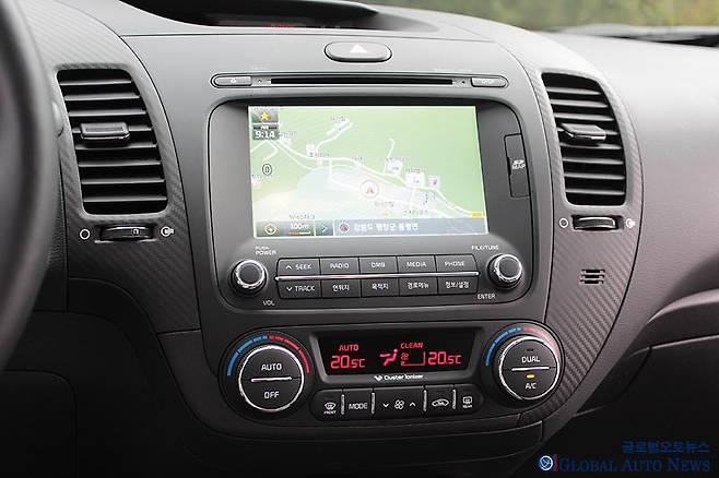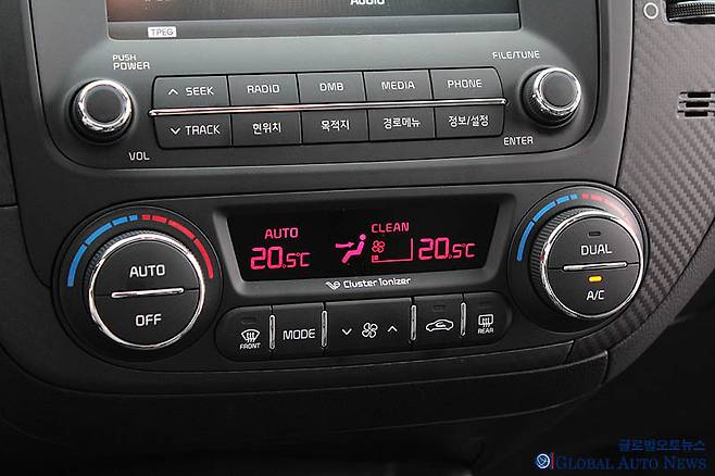 센터페시아의 배열은 7인치 내비게이션 모니터가 중심을 잡고 있다. 이 부분에서의 포인트는 쏘렌토에서부터 적용한 UVO라는 텔레매틱스. 오늘날 새로운 키 워드인 커넥티비티의 시작 단계로 스마트 폰을 통핸 원격 시동/ 온도 조절 등 원격 제어가 가능하고 안전 보안 및 차량 진단도 할 수 있다. 그 아래 오디오와 에어컨 컨트롤 패널이 간결하게 정리되어 있다. 당연히 에어컨에는 듀얼 모드가 있다.
