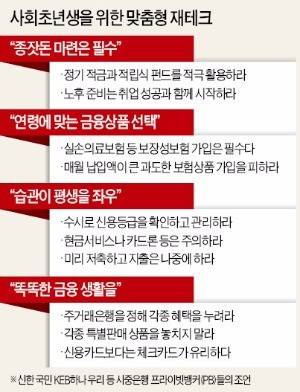 무엇보다 재테크 습관을 들이는 게 중요하다. 사회초년생에게는 신용카드보다 체크카드가 낫다. 대출 기능이 없이 계좌 잔액 안에서만 결제가 가능해 합리적인 소비 생활에 도움이 된다. 연말정산에도 유리하다. 상대적으로 저렴한 보험료로 각종 위험에 대비할 수 있는 실손의료보험 가입도 사회초년생에게 필요하다. 자동차보험에 가입할 때는 부모의 자동차보험을 확인해 보험료 할인 혜택을 받을 수 있는 요건에 맞는지도 살펴야 한다.