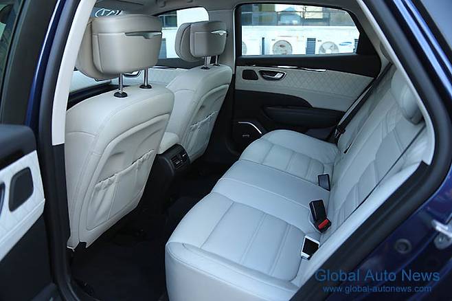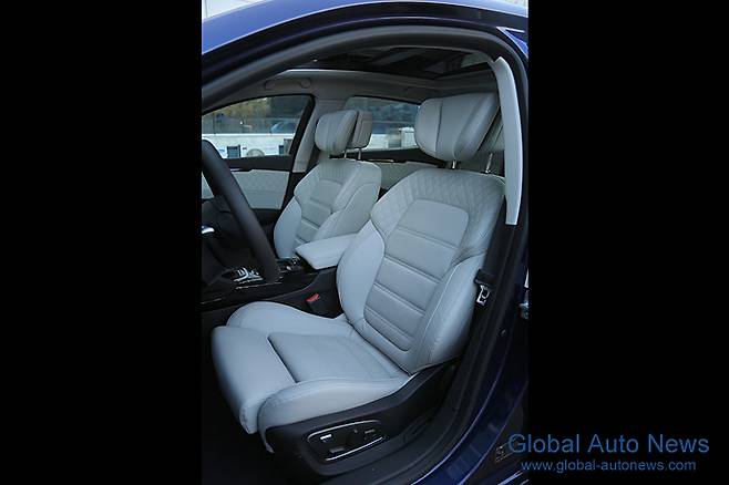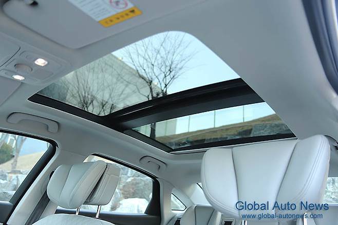 시트는 5인승. 감성 품질을 위한 다양한 시도가 보인다. 퀄팅 나파가죽 시트와 차종에 따라 레저를 이용한 마무리, 선루프 블라인드를 중간에 이음매 없이 처리한 것 등이 그것이다.