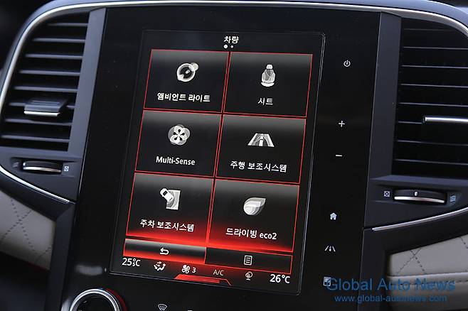 멀티 센스라는 주행모드 기능도 처음으로 적용됐다. 컴포트와 스포츠, 에코, 중립, 개인 등 다섯 가지 모드가 있다. 모드를 바꾸면 계기판과 대시보드 중간 부분의 색깔이 변한다. 이것도 다섯 가지 색깔이다. 시승 운전시에는 변속 레버 뒤의 단축 버튼으로 스포츠와 컴포트 모드만을 작동하게 된다. 두 모드의 거동 차이는 뚜렷하다. 개인이 원하는 인디비주얼 모드로 설정하고 다니면 좋을 듯하다. 주행성뿐 아니라 시트와 스티어링 휠의 위치까지 모두 원하는 세팅이 가능하다. 조작도 쉽다.