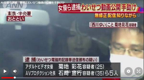 2일 아사히TV는 성인 여배우 니시카와 유이(본명 키쿠치 아야카‧菊地彩花)와 AV(Adult Video) 제작업체 대표 이시자키 노부유키(石崎宣行‧35) 등 5명이 무보정 성인 영상물을 제작‧배포한 혐의를 받고 있다고 전했다. 일본 경시청에 따르면 이번에 체포된 5명 가운데는 남성 AV 배우 2명도 포함됐다.